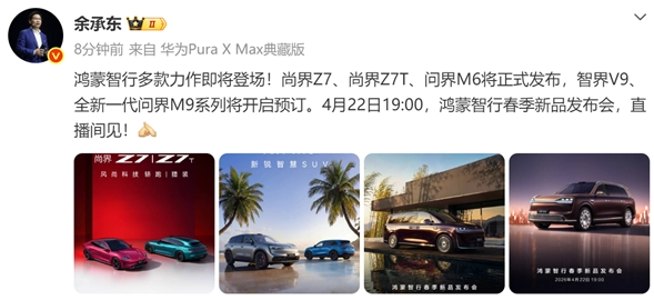华为即将在智能汽车领域释放重磅动作。华为常务董事余承东近日通过社交媒体正式发布预告,宣布鸿蒙智行旗下的多款全新车型即将集中亮相。 根据余承东发布的消息,鸿蒙智行春季新品发布会定于4月22日19:00举行。届时,尚界Z7、尚界Z7T以及问界M6三款新车将正式发布,进一步完善鸿蒙智行的产品布局。 除了新车的正式发布,智界V9以及全新一代问界M9系列也将同步开启预订。其中,智界V9作为鸿蒙智行旗下的首款MPV车型,凭借其大型MPV的定位和深厚的技术加持,成为了此次发布会备受瞩目的焦点。 智界V9的车身尺寸表现出色,长度达到5359mm,轴距更是长达3250mm,内部采用了2 2 3的经典布局。其第二排配备的双独立座椅极具功能性,不仅支持45度迎宾模式,还能实现90度观景以及180度对坐。 在动力系统方面,智界V9增程版搭载了由1.5T发动机与前后双电机组成的动力总成。车辆匹配了宁德时代提供的磷酸铁锂或三元锂电池,在WLTC工况下的纯电续航里程覆盖了158公里到223公里的区间。 为了提供极致的驾乘舒适性,该车还搭载了双腔空气悬架,车身最高可抬升50毫米。同时,智界V9还配备了后轮主动转向技术,这让一款身形庞大的大型MPV拥有了仅为5.35米的转弯半径,大幅提升了在城市道路中的操控灵活性。 此次发布会不仅是鸿蒙智行产品线的一次大规模更新,更展示了华为在智能座舱、动力系统以及底盘操控等全方位的技术融合。随着多款新车的集中登场,华为在高端汽车市场的竞争力将得到全方位的提升。 |