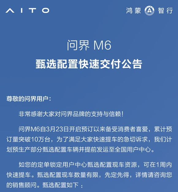 问界M6真是太火了,自从3月23号开启预订,累计预订量已经突破10万台。 很多订车的朋友都急着提车,官方也考虑到了这一点,特意推出了甄选配置的现车,提前生产好并发运到全国的用户中心。 只要你锁定了用户中心的甄选配置现车,一周之内就能提到车,不用再漫长等待。不过要注意,甄选现车数量有限,还是先定先得,具体的可以问问自己的销售顾问。 甄选配置涵盖了三个版型,分别是Max增程四驱、Ultra增程四驱和Max纯电长续航版,每个版型都有多种外饰、内饰和轮毂可选,还有副驾零重力、后排娱乐套装这些选装配置,能满足不同人的需求。 如果你的配置不在甄选清单里,暂时还没法确定提车时间,官方说会在大定开启后公布交付周期,要是急着用车,不妨考虑换成甄选配置,大定开启时间等官方通知就行。 还有人问现在锁定甄选配置,能不能在五一前提车,官方说发布会前各地会有部分现车到店,最好等大定开启后联系销售顾问,帮忙锁定现车资源。 |