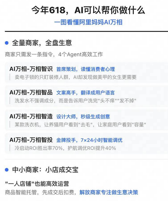 电商圈的气氛有些微妙。商家社群里,讨论“模型跑得怎么样”的声音,正在与“优惠券力度怎么设”并驾齐驱。这种变化的背后,藏着一股巨大的推力——AI。 前几天和淘天行业内部人士交流,几个真实案例让人印象深刻。拿国补热销的电子锁来说,在传统电商思维中,房地产、装修是重点客群,按照商家们经典打法,打标签,投关键词,是稳妥的路径,但在AI加持之下,除了找到装修的人之外,做美甲的人,也很有可能买电子锁。逻辑也不复杂,女孩子做美甲,指甲很长,拿钥匙开门非常不方便,自然更需要电子锁。 这些藏在商家认知盲区里的增量,只是AI给电商带来变化的一个切面。而从商家的视角来看,当下的集体焦虑,如,多平台运营顾此失彼、熬夜盯盘调价换不来稳定ROI、品牌投入看不到可量化回报,在AI时代或将有全新的解法,从某种程度来说,商家需要的从来不是另一套更卷的运营技巧,而是一套跳出认知边界,更好懂、更好用的AI经营大脑,来帮商家进行全新的决策。 在这样的背景下,618这场大考也在升级。它不再只是流量与价格的博弈,而是商家经营思路和执行力的对决,AI或将成为决定胜负的核心变量之一。 面对这场硬仗,4月22日,阿里妈妈在618新策见面会上释放了一个明确的信号:将所有AI能力投入到解决商家的实际经营难题中,用AI帮助商家挖掘潜力、创新增量、创造利润。而承载这一战略的核心底座,正是为商家量身打造的「AI万相」——超级经营智能体引擎。 为了让这套“AI引擎”真正帮商家实现持续稳定的生意增长,AI万相不仅部署了四个协同作战的Agent(覆盖洞察、推理、文案、设计、投放等全流程),更针对商家在618期间的具体需求,密集推出了一系列精悍、实用的新AI工具,让品牌力可衡量可优化的“品牌新力WIN”、能读懂用户搜索意图的“AI点睛”、实时捕捉全网热点的“趋势速递”、一键生成全套创意的“妙应Mio”、面向中小商家的“小店成交宝”,以及618期间重磅上线的“无界智惠券”,平台出资帮助商家提高转化,实现增长。谁能率先驾驭这个“AI引擎”,谁就能在今年的618战场上拿到一张确定性的增长底牌。 |