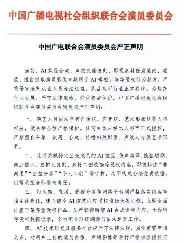 中国广播电视社会组织联合会演员委员会针对行业内频发的AI侵权乱象发布严正声明,正式对AI换脸、声纹克隆及未经授权抓取数据训练模型等行为亮剑。 声明明确界定了七类禁止性行为,涵盖了从影视素材篡改到AI模型训练的闭环流程,并特别强调,即便标注“非商用”、“公益分享”或“个人二创”等字样,亦不能构成法律免责依据,侵权主体仍需承担全部法律责任。此举标志着演艺行业在面对生成式AI技术冲击时,正由零散的个体维权转向系统性的行业协同监管。 此次声明的发布源于持续发酵的行业维权风暴。自3月13日起,以729声工场旗下的谷江山、赵爽为代表,包括边江、季冠霖等近百位顶尖配音演员相继发声,抵制成本不足百元、仅需数分钟原声即可复刻的AI声音克隆技术。 随着北京互联网法院近期宣判全国首例AI声音侵权案及短剧AI换脸明星案,司法的边界已愈发清晰。本次声明进一步明确了平台与技术方的审核义务,要求建立内容授权核验机制与侵权快速处置通道。 |