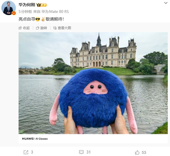 华为终端BG CEO何刚在微博发布新品预告,晒出华为AI眼镜的实拍照片,正式宣告这款新品即将登场。 何刚用亮点自寻、敬请期待作为文案,也让不少用户对这款新品的隐藏功能充满期待。 画面中,何刚双手托着玩偶,第一视角沉浸感十足,水印显示拍摄设备是华为AI眼镜。有了它,拍照可以彻底解放双手了。 而且这张照片的分辨率高达4096x3072,超过了传统4K,上下视野更宽。 此前消息显示,这款AI眼镜有望在4月和华为Pura 90系列、阔折叠二代一同发布。 根据此前爆料,华为AI眼镜定位轻量化智能穿戴设备,整体设计简约时尚,预计提供流光银、钛银灰、摩登黑三种配色,日常佩戴不突兀,兼顾颜值与实用性。 这款眼镜功能相当全面,支持拍照、录制视频,还能实现音频播放、同声传译,出门旅行、跨国交流都很方便。它内置三块锂电池,在保证续航的同时,依旧保持轻量化机身,长时间佩戴也不会有明显负重感。 依托鸿蒙OS系统,华为AI眼镜可以和手机、平板等设备无缝协同,内容能快速同步流转。搭配小艺AI助手与摄像头,还能实现AI识物、实时信息播报等实用功能,相当于把智慧助手戴在了脸上。 |