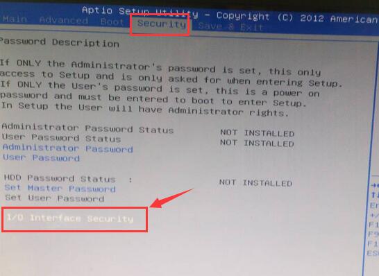 华硕电脑开机时显示一连串字符并且没办法正常进入系统中,多次重启都出现这样的状况。经过查询,所显示的内容表示电脑从网卡启动,一般提示的内容是“PXE-MOF:Exiting PXE ROM”,当然了,个别电脑网卡设置也会不一样,显示的内容也会不同。解决的方法是进bios关闭网卡启动,下面来看看华硕电脑怎样关闭网卡启动。![]() 1、华硕电脑开机,待开机画面出现时快速连续按热键f2进入bios界面,按→方向键移动到“security”选项,找到“I/O Interface Security”选项按回车键,如图: 2、在显示的界面中选择“LAN Network Interface”选项回车,如图: ![]() 3、弹出的小窗口中有两个选项,LOCKED表示关闭,UNLOCKED表示开启,所以这边选择LOCKED选项回车,如图: ![]() |