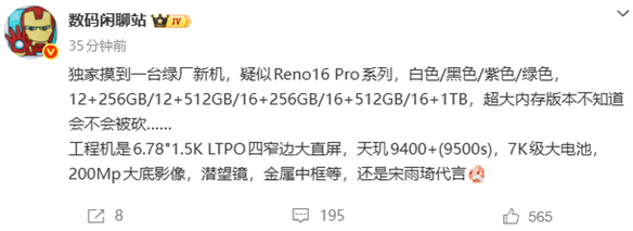博主数码闲聊站”曝光了OPPO Reno16 Pro的部分核心配置,新机延续由宋雨琦代言。 OPPO Reno16 Pro将提供白、黑、紫、绿四款配色,并带来12GB 256GB、12GB 512GB、16GB 256GB、16GB 512GB、16GB 1TB等多种存储组合。 不过该博主也提到,超大内存版本最终是否保留仍存在变数。 核心配置方面,工程机采用6.78英寸1.5K四窄边直屏,搭载联发科天玑9400(9500s)处理器,内置7000mAh级大电池。 影像部分,新机配备2亿像素主摄,并辅以一颗潜望式长焦镜头,其中主摄预计为ISOCELL HP5传感器,尺寸为1/1.56英寸。 据了解,天玑9400是天玑9400升级版,采用台积电3nm工艺,延续天玑9400全大核CPU架构设计,包含1颗Cortex-X925超大核、3颗Cortex-X4超大核以及4颗Cortex-A720大核,主频进一步提升。 作为对比,上代OPPO Reno15 Pro配备6.78英寸直屏,搭载天玑8450处理器,内置6500mAh电池,支持80W有线快充和50W无线充电,并拥有由2亿像素主摄、5000万像素潜望长焦、5000万像素超广角以及前置5000万像素镜头组成的影像系统。 |